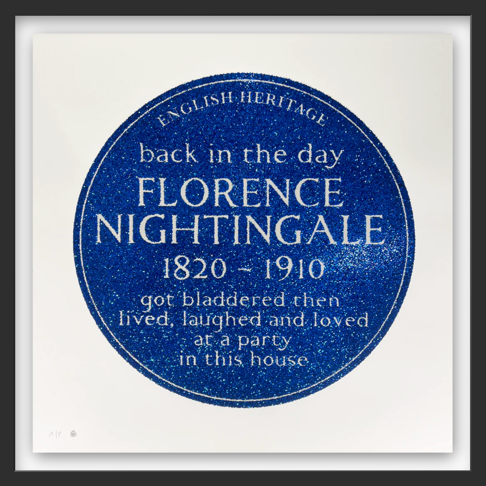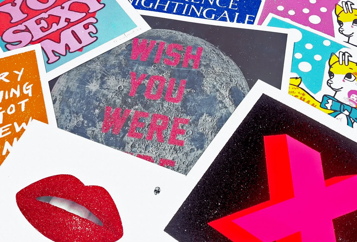 New arrivals at Electric Gallery include Glitter Kiss and Wish You Were Here (Moon) by Dave Buonaguidi, alongside an irreverent Florence Nightingale blue plaque satire. To expand the story, we are pairing them with standout works that already embrace shine: Some Like It Hot (Red Glitter Edition) by Cassandra Yap, Nūr Jahān by Damien Hirst, Brigitte Bardot (Blush Pink, Diamond Dust) by David Studwell, and Sexy MF (Diamond Dust Edition) by Oli Fowler.
