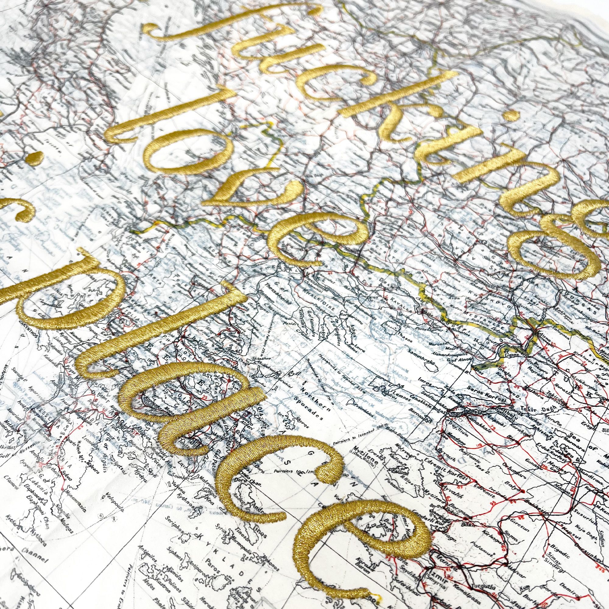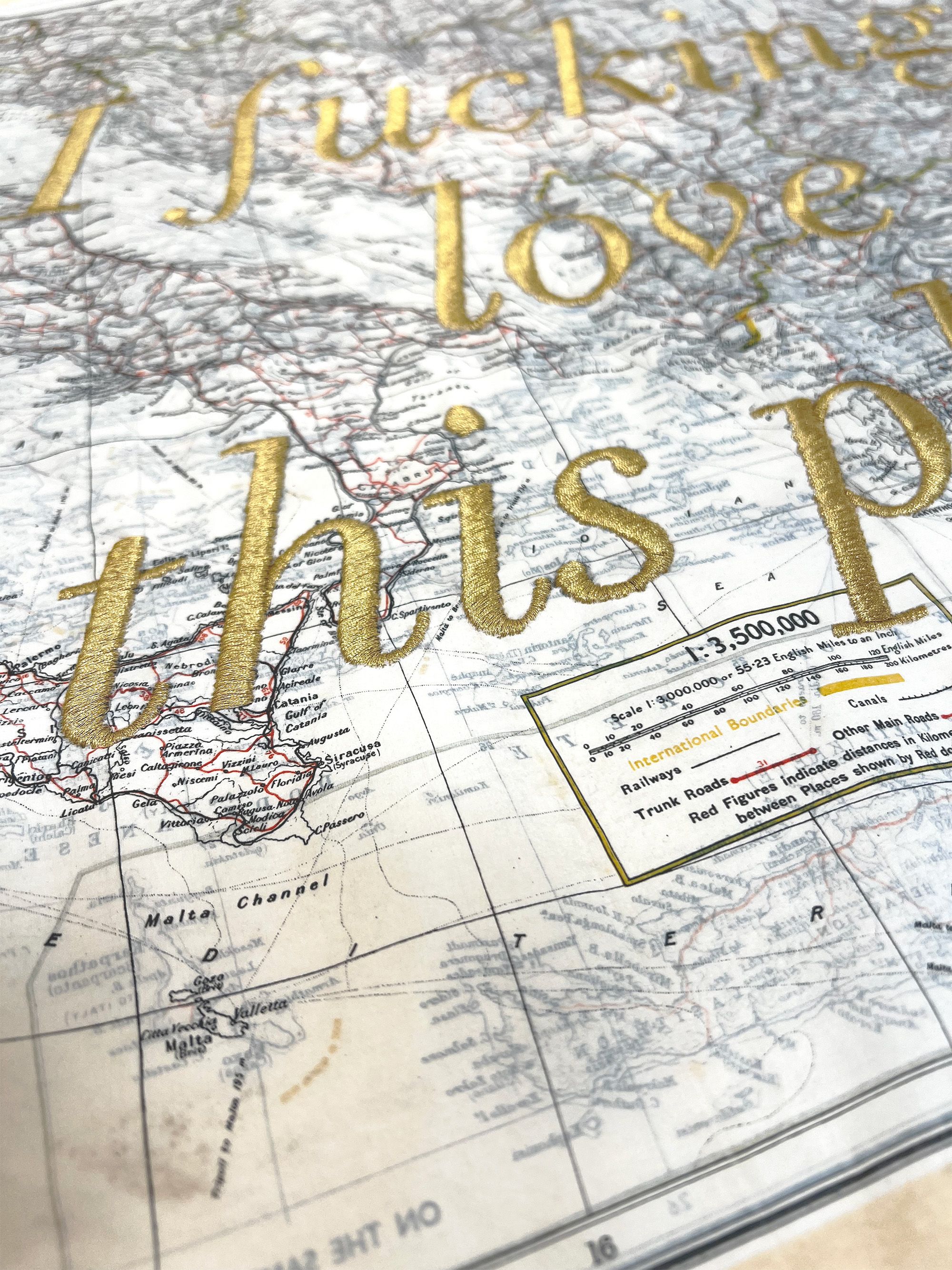 This edition celebrates Southern Europe, Italy, the Adriatic coast, and beyond, stitched with unapologetic joy. The gold thread shimmers against the aged cartography, contrasting modern irreverence with antique elegance. Every map carries its own history: softened edges, small tears, the quiet marks of time.