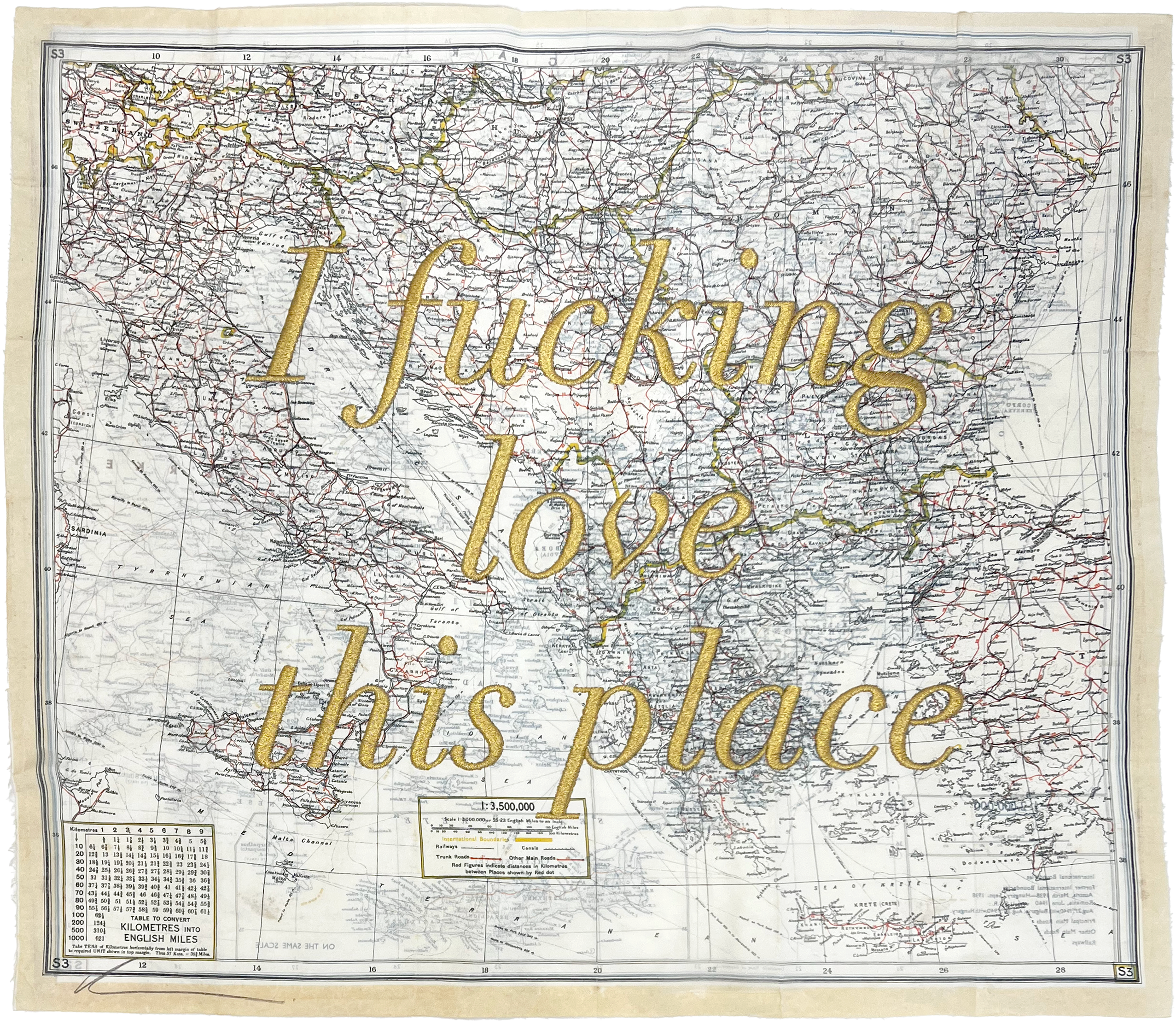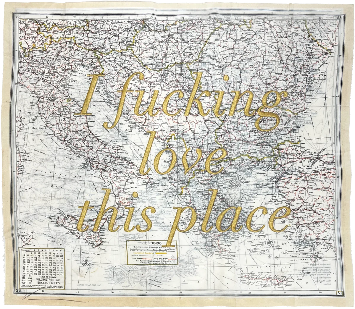 Dave Buonaguidi has never been one to whisper. His latest work, I Fucking Love This Place, takes the energy of travel and pins it to fabric. Quite literally. Each vintage map in this new series is overlaid with gold embroidered typography, transforming found materials into tactile declarations of affection for the world’s most beloved destinations.