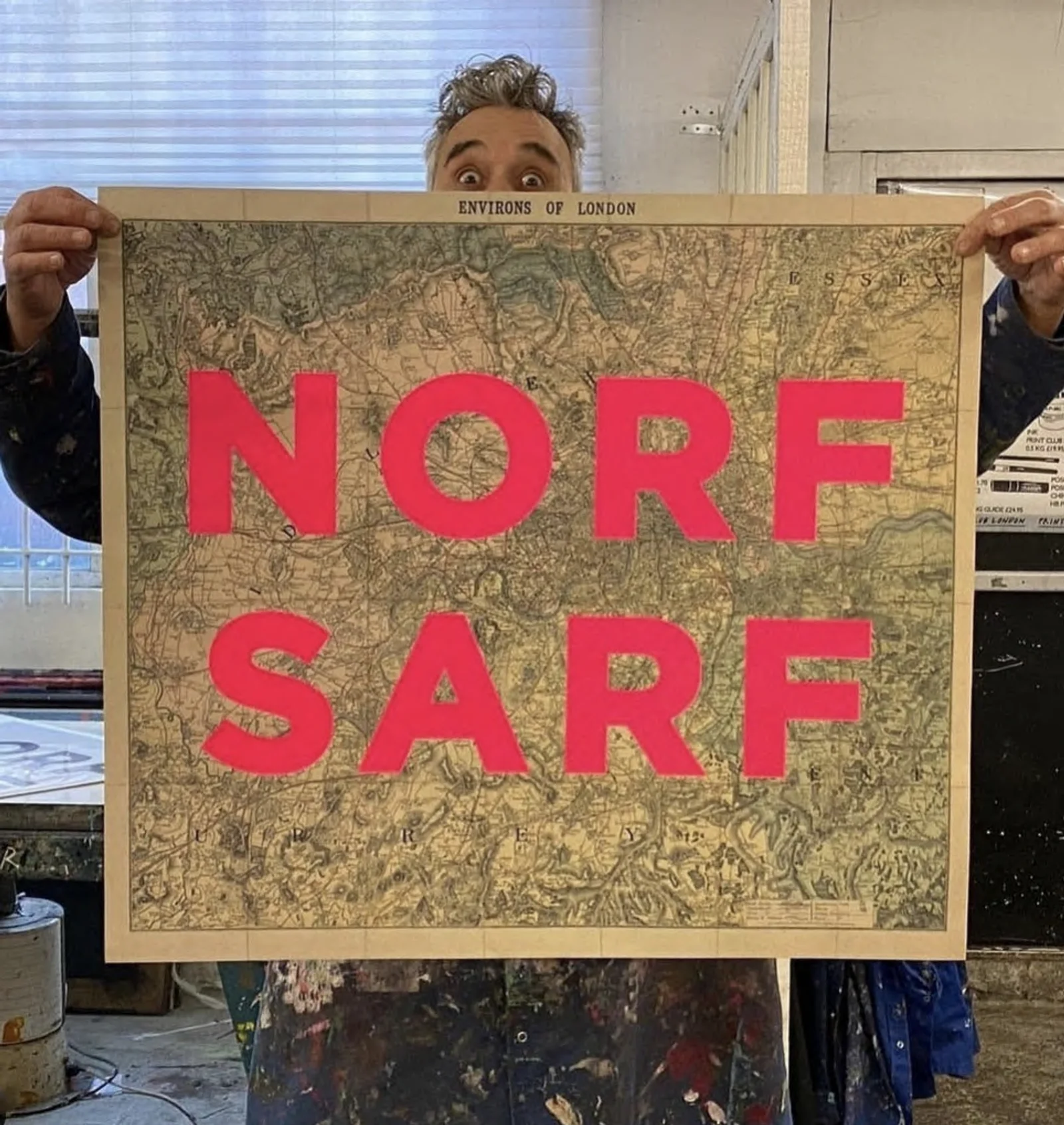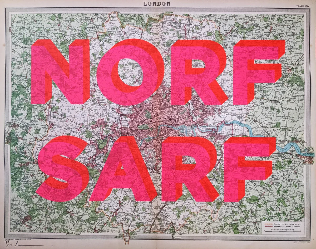 Some of the available pieces include True Love Never Dies, Hoxton AF, and Norf Sarf. All multi-layered colour screenprints, on original found materials such as original 80's gun range target paper and vintage maps of London.