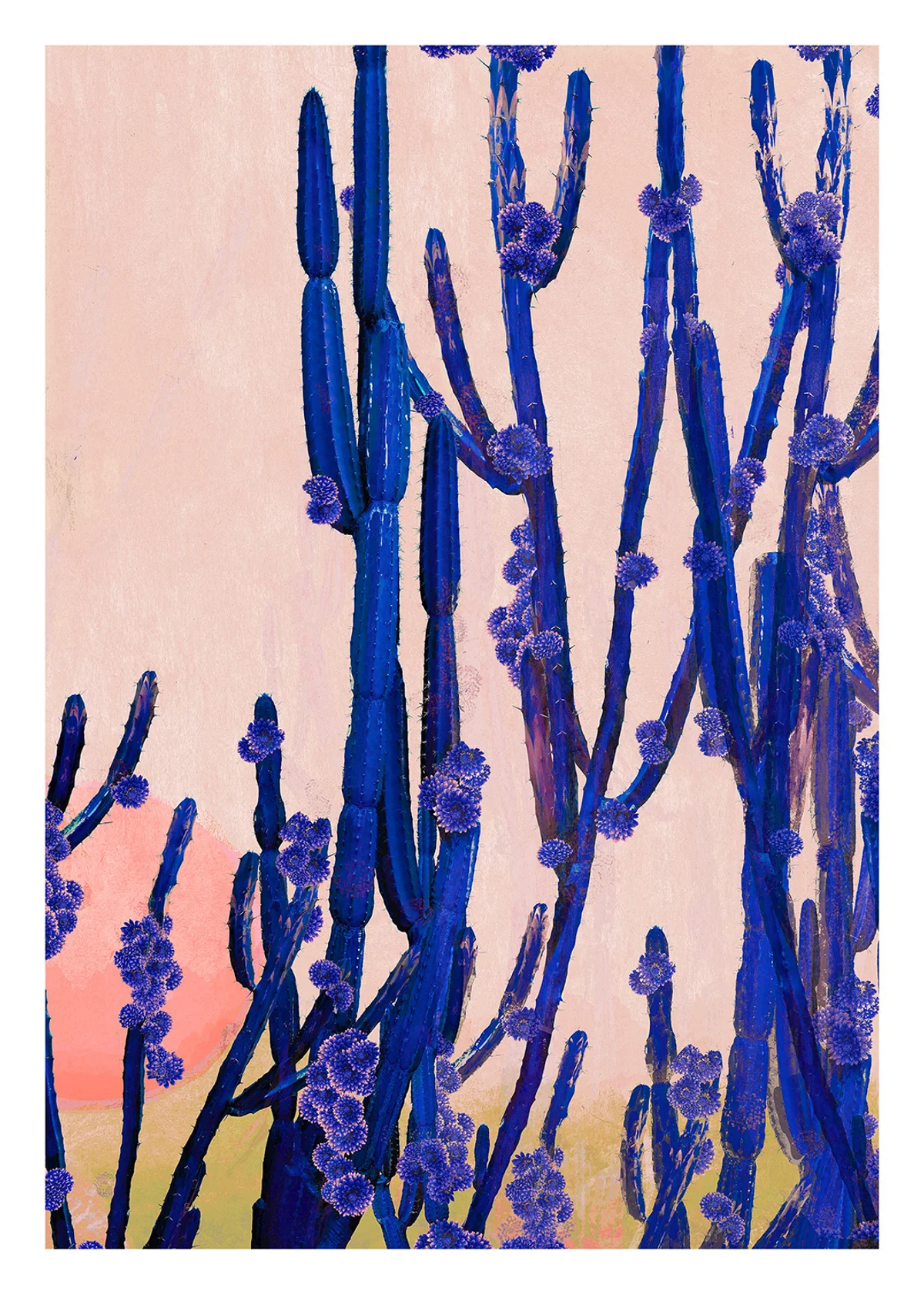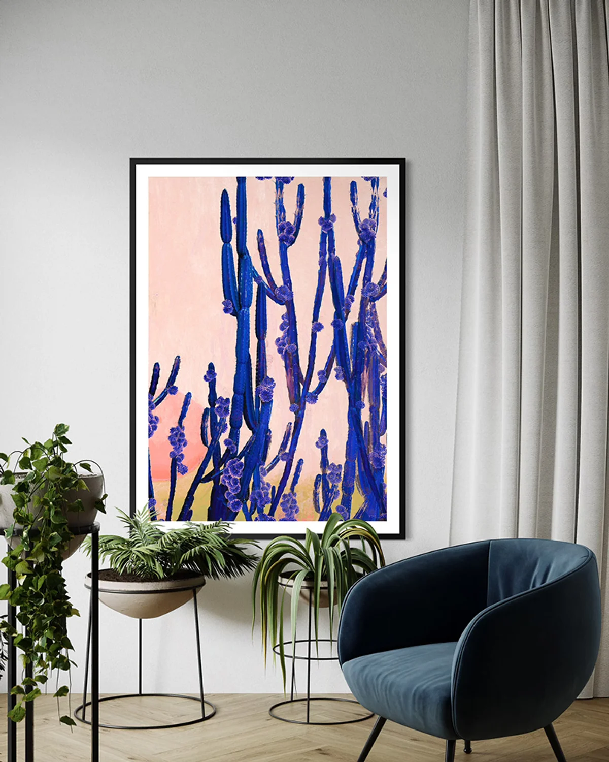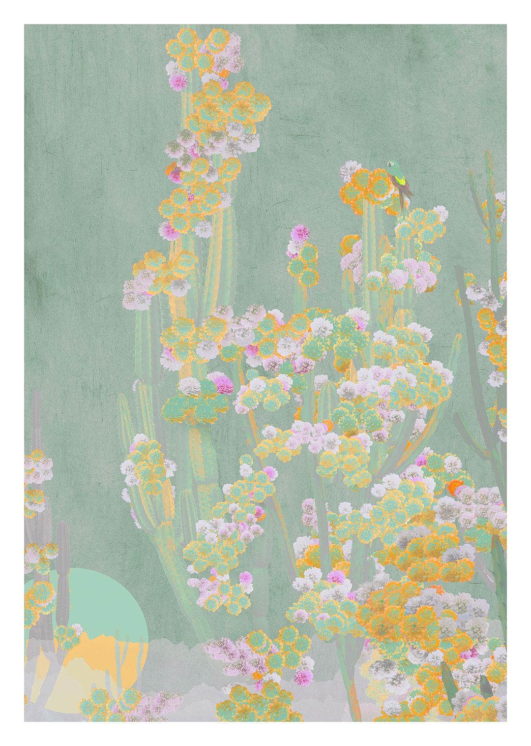 Nadia’s Cactus Midnight, Cactus Valley, and Cactus Jade form a lyrical trilogy of desert botanicals. Inspired by travels through Palm Springs, Arizona, and Southeast Asia. Each work celebrates the resilience and rhythm of nature: moonlit silhouettes, sun-baked trails, and imagined oases layered in chalk and ink. There’s a quiet spirituality in these pieces. The sense of standing still in vastness, of feeling connected to the earth and sky.