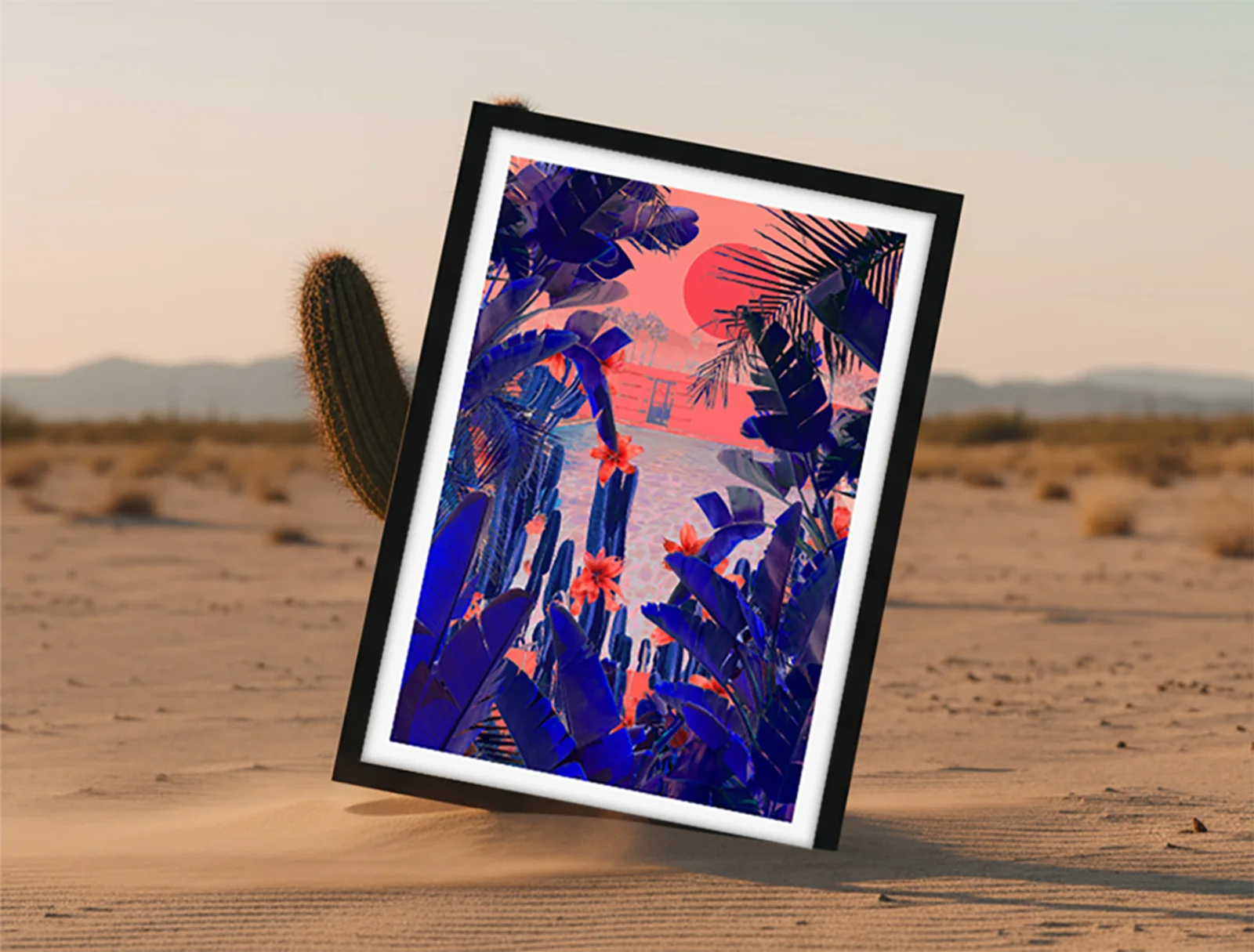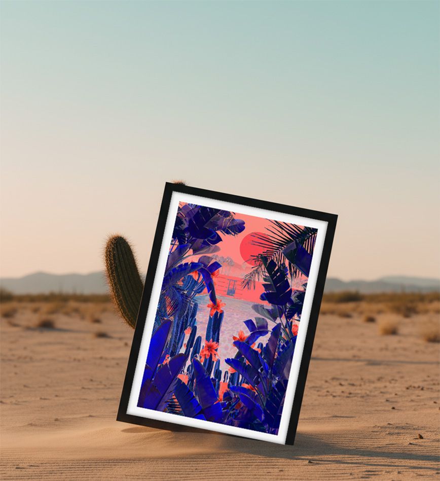 Sunshine, salt air, and Miami’s pastel glow. Blue Keys captures the breezy optimism of coastal walks through the Florida Keys, merging photography, collage, and paint into a serene statement piece. Its cool palette makes it a natural companion for modern spaces. Tranquil yet uplifting, nostalgic yet new.
