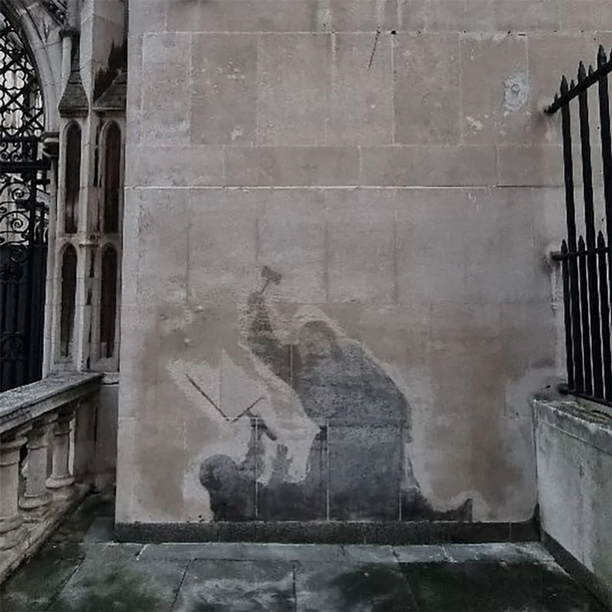 Update 11/09/2025 - As shown in the image below from Banksy Archive, the art piece by Banksy on the Royal Court of Justice has been removed, leaving a sinister shadowy remnants - perhaps even more symbolic than the original artwork...