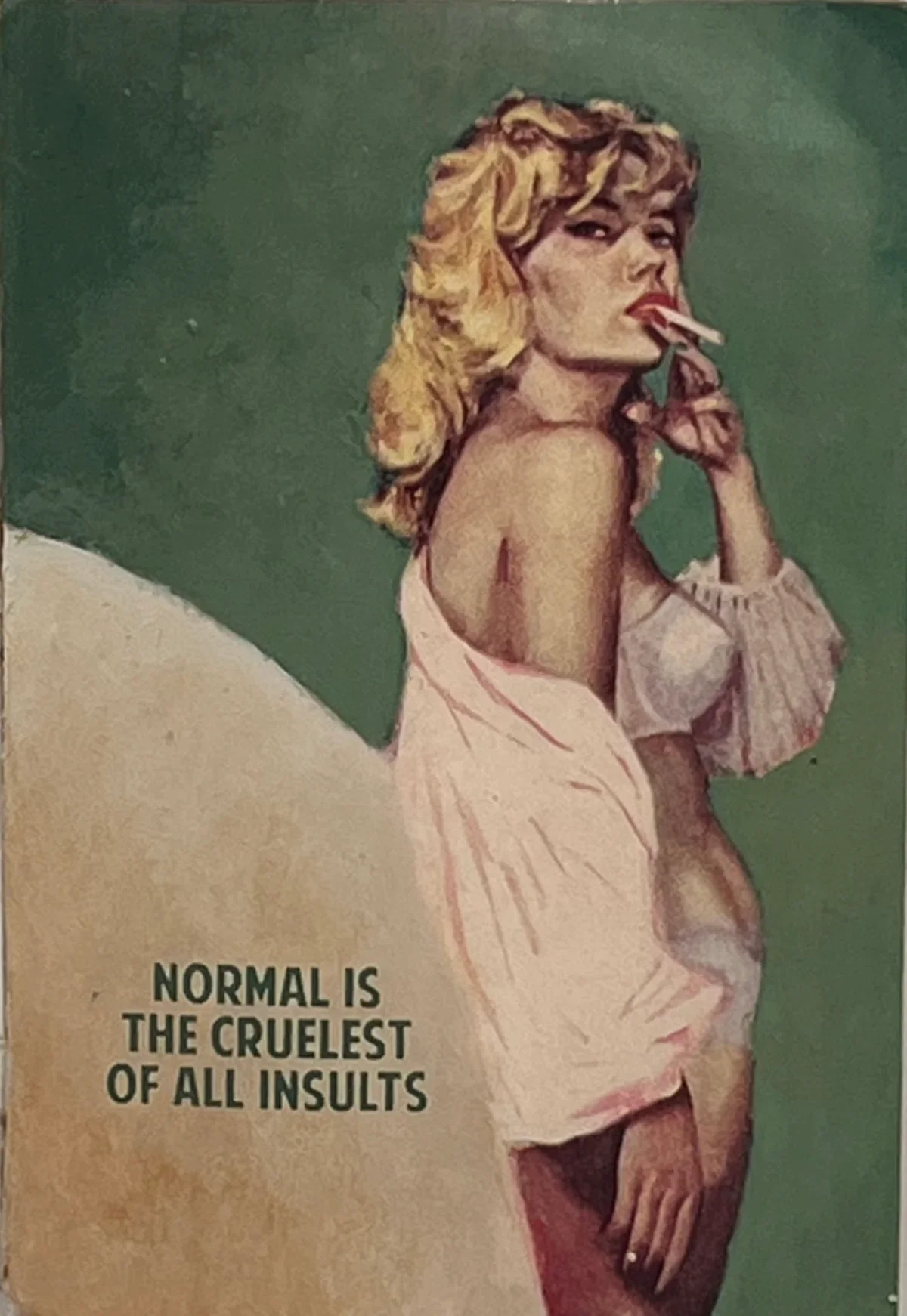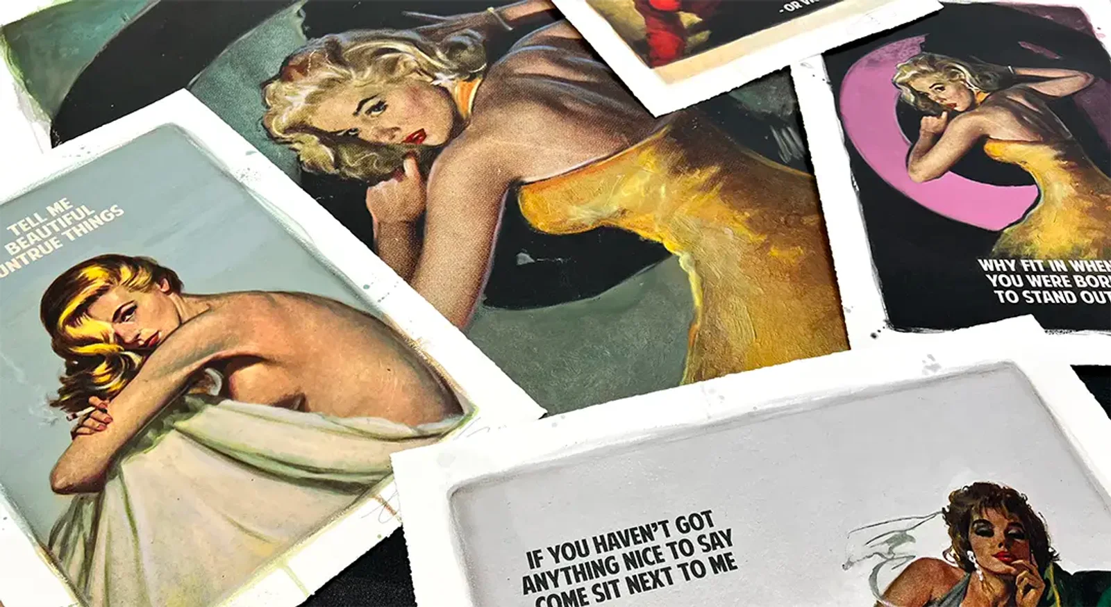 Picture this: 1950s paperback covers reimagined with razor-sharp quotes like:
