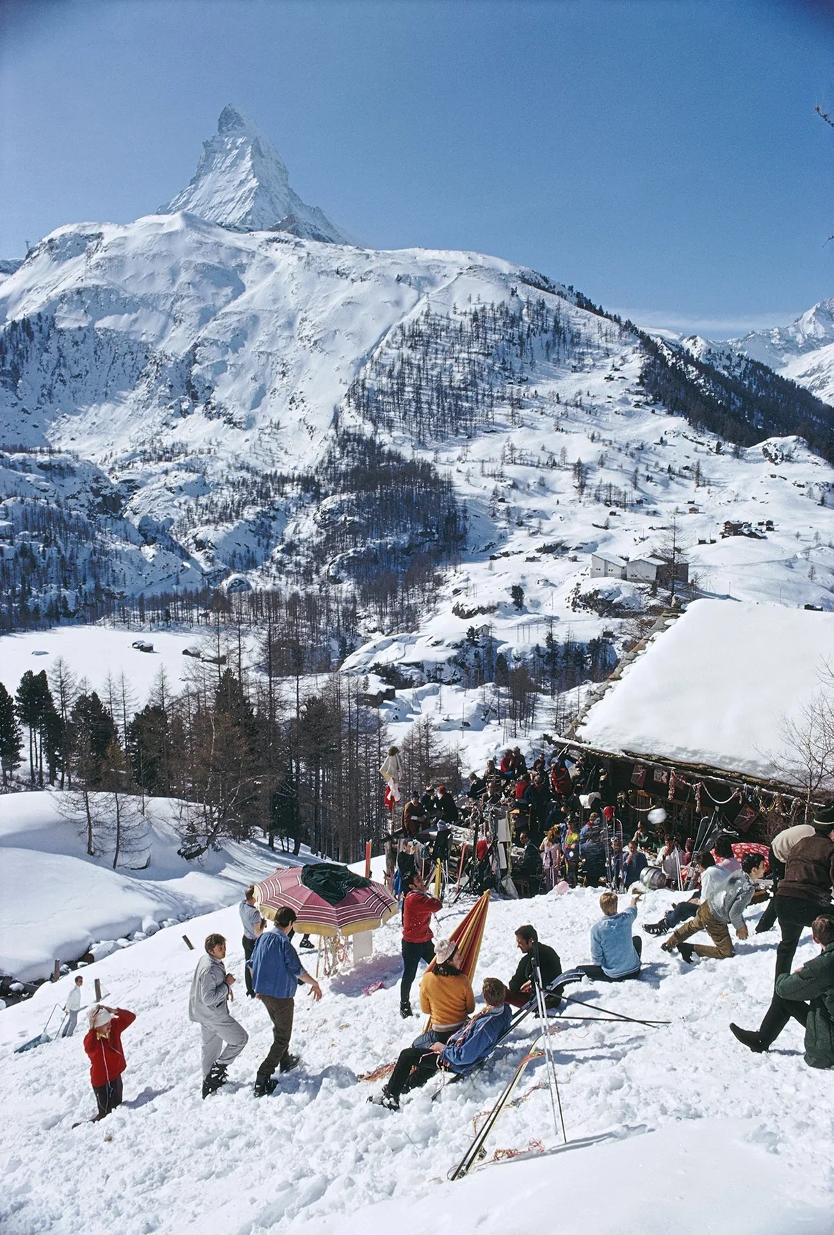 Immerse yourself further. Explore our Slim Aarons Winter Prints Collection, featuring all 11 works: Lounging in Verbier, Verbier Vacation, Zermatt Skiing, Lounging in Gstaad, Culinary Heights, Christmas Swim, Skiing Waiters, Chalet Costi, Snowmass Gathering, Drinks at Gstaad, and Klosters. Each photographic winter print is available in multiple sizes & framing options, and is a curated gem in the realm of ski society photography.